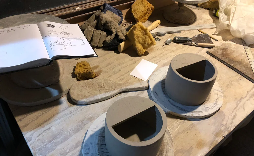 It’s has been really exciting to review Bob’s ideas for construction and watch a master of clay realize my forms and the objects I designed. Bob mixes his own clay, builds everything by hand and fires the work in his self-made kiln.